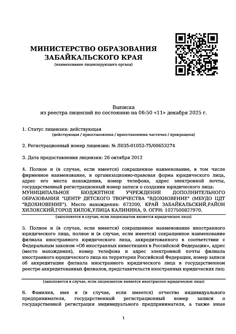 Реестровая выписка МБУДО ЦДТ «Вдохновение»